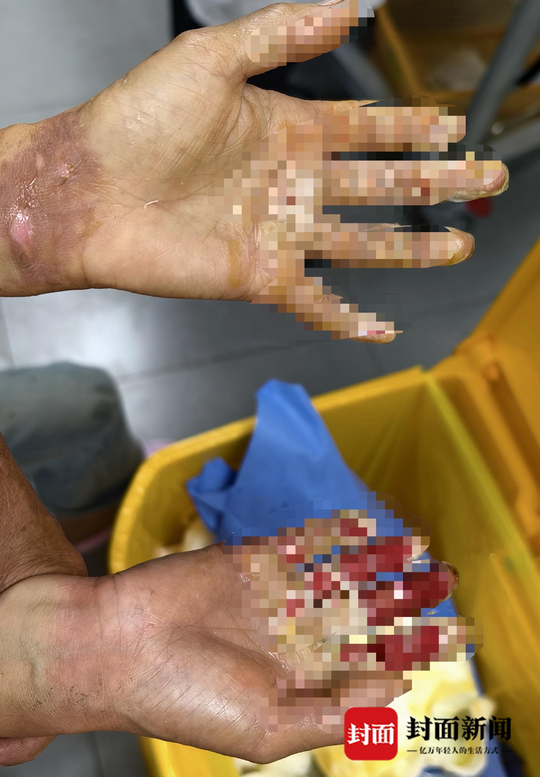 “就几秒钟的时间,我们这边马上给孩子冲凉水,他身上的皮肤就已经有了变化。”一段现场视频显示,事发后,现场人员将钟宇放在塑料筐中降温,其手臂、大腿等多处皮肤表面,明显出现了有色差的部分。刘萍的双手,也被不同程度烧伤。